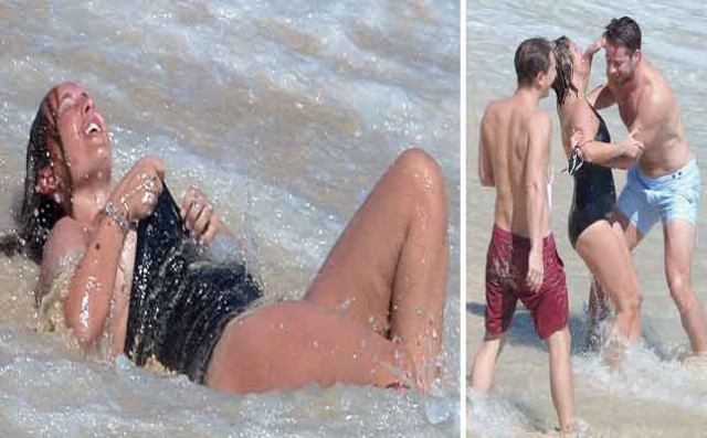 صور... الأمواج تعري صـدر النجمة البريطانية "لويز ريدناب" بالكامل