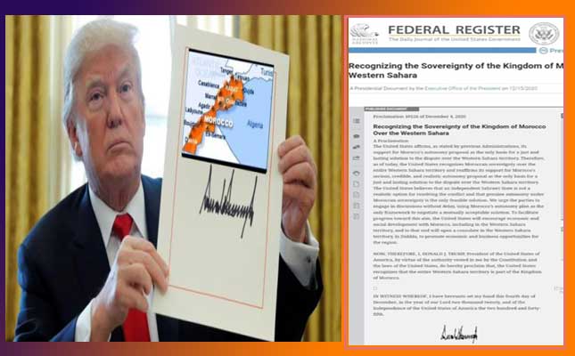 بعد اعتراف الولايات المتحدة بالسيادة المغربية الكاملة على كافة صحرائه، و الذي تبعه توقيع سفير الولايات المتحدة الأمريكية في المغرب ديفيد فيشر، السبت12 دجنبر2020 بالرباط، على خريطة المغرب التي تشمل الأقاليم الجنوبية، والتي اعتمدتها رسميا الحكومة الأمريكية. اليوم، ينتصر المغرب من جديد على خصوم وحدته الترابية، إثر نشر القرار الرئاسي للبيت الأبيض، في السجل الفدرالي الأمريكي (بمثابة الجريدة الرسمية )، في عدده ليوم14 دجنبر 2020. ...