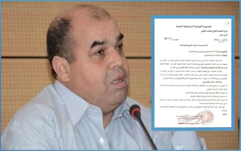 وهو رد على تصرفات نظام جزائري شغله الشاغل في كل تحركاته الداخلية والخارجية هو الإعلان عن عدائه المتجدد للمملكة المغربية، وبذلك يضيع على الشعب الحزائري الشقيق وعلى الشعب المغربي وعلى كل الدول المغاربية فرص ربح ما يفوق النقطتين من الدخل الفردي، ويضيع على المنطقة فرص كونها قوة مغاربية اقتصادية وثقافية واجتماعية وأكاديمية، ولو كان النظام الجزائري عاقلا و قارن بين الربح والخسران في عداوته المجانية تجاه المغرب لاختار تقوية العلاقات مع جاره وتحاشى سياسة اختلاق العداوات المجانية معه، لكن مع كل أسف لا منطق ولا عقل لهذا النظام الذي يقضي أيامه يبحث عن مجالات الاختلاف المفتعلة، كان آخرها ما حصل لاخواننا الصحافيين والرياضيين المغاربة المشاركين في ملتقى وهران 2022، و مباشرة بعدها فوجئ لرأي العام الوطني والجزائري خصوصا والرأي العام الدولي بمضمون الرسالة الصادرة عن وزارة التعليم العالي بالجمهورية الجزائرية، والتي وقعها السيد الأمين العام لذات الوزارة بتاريخ 3 يوليو 2022 تحت رقم 1063 / أ.ع / 2022، والتي اشرنا الى مضمونها، فكيف لنظام يتخذ قرارات ضد الأساتذة الباحثين لأنهم اعضاء لجنة علمية لمجلة صدر بها مقال علمي لباحث شاب يناقش القضية الوطنية وينتصر الطرح المغربي، أليس لهذا النظام اساليب اخرى للرد على هذا الطرح باخلاق علمية اكاديمية ؟ عوض اللجوء الى منطق السلطة و المنع كما هو مبين في مضمون الرسالة، بل تعدى ذلك إلى منع أي مشاركة جزائرية في المؤتمرات والندوات المنظمة في المغرب مع عدم نشر أي مقال أو بحث في المجلات المغربية بكل تخصصاتها !!!!!.