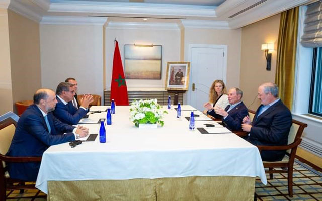 على هامش الدورة الـ77 للجمعية العامة للأمم المتحدة بنيويورك إلتقى رئيس الحكومة، عزيز أخنوش، رفقة محسن الجازولي، الوزير المنتدب لدى رئيس الحكومة المكلف بالاستثمار والالتقائية، وتقييم السياسات العمومية، ب "مايكل بلومبيرغ" رجل الأعمال والسياسي الأمريكي، والمبعوث الخاص للأمم المتحدة للمدن وتغيير المناخ.