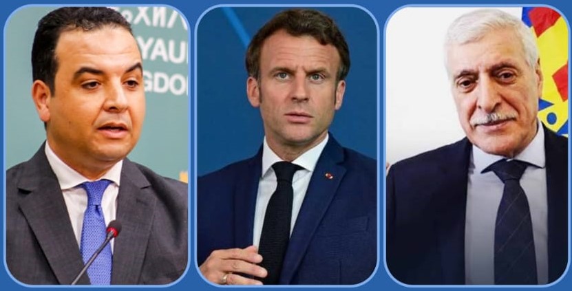 تعرف على رد الحكومة بخصوص بلاغ السفارة الفرنسية للمغرب حول فضيحة منع "فرحات" إيمانويل ماكرون يتوسط فرحات مهني (يمينا) ومصطفى بايتاس