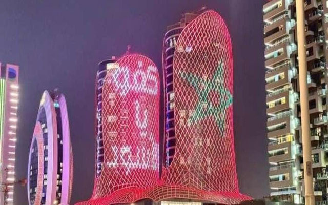 أما أبراج دوحة الخير الشاهقة فتزينت بالأعلام الوطنية احتفالا بهذا الإنجاز التاريخي، الذي يشكل مصدر اعتزاز للمغاربة وللعرب من المحيط الى الخليج ولإفريقا، العمق الاستراتيجي للمغرب.