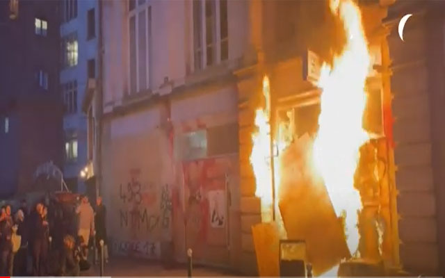 اشتعلت النيران في باب مركز للشرطة في وسط رين وباب مركز المؤتمرات مساء الجمعة 14 أبريل 2023 خلال مظاهرة ضد قرار المجلس الدستوري المصادقة على الجزء الرئيسي من إصلاح نظام التقاعد ، بحسب صحفيي وكالة فرانس برس.
