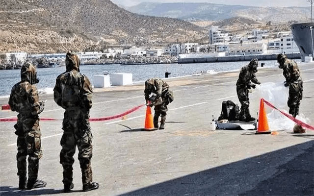 في إطار التعاون المغربي الأمريكي في مجال تدبير الكوارث، جرى، اليوم الأحد بالميناء العسكري لأكادير، تمرين موجز حول مكافحة أسلحة الدمار الشامل، لتقييم تفاعلية وحدة الإنقاذ والإغاثة التابعة للقوات المسلحة الملكية في مواجهة مواجهة هجوم بطائراتين مسيرتين انتحاريتين، يمثل وضعية أزمة تتعلق بمخاطر كيميائية.
