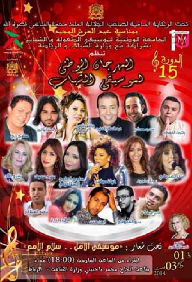 تنظم الجامعة الوطنية لموسيقى الطفولة والشباب بشراكة مع وزارة الشباب والرياضة الدورة الخامسة عشرة للمهرجان الوطني لموسيقى الشباب، وذلك أيام فاتح وثان وثالث غشت 2014 بقاعة الحاج محمد باحنيني على الساعة السادسة مساء، حيث ستشارك في الحفل الافتتاحي والاختتامي مجموعة من الأسماء الشبابية في مجال الغناء كالفنانين: عبدالعالي الغاوي- سعيد مسكير - فاطمة الزهراء العروسي - سامي راي- زكرياء الغفولي – يسرى سعوف – سحر الصديقي- معتز أبو الزوز- رباب نجيد – بشرى خالد – أمين الرينكة – أيمن سعد – بدر معروفي سعيد الفيلالي – أمال بوجندار.. إضافة إلىمجموعة من الموسيقيين الشباب من مختلف المدن المغربية، بالإضافة إلى التباري في الأغنية العصرية والأغنية الشبابية (ray- rapfusion- Rnb- hip hop)- ومواد فنية أخرى شيقة، فضلا عن إقامة حفل تكريم على شرف الفنانة الشابة خولة مجاهد بمناسبة أدائها المتميز بالبرنامج الغنائي الناجح "the voice".