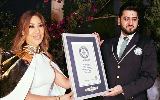 وقدم ممثل موسوعة غينيس في الأردن درعا تكريميا لشمس الأغنية اللبنانية، معلقا: "يسعدني اليوم الإعلان عن رقم قياسي عالمي جديد لأطول رداء، والذي بلغ 55.7 متر، ارتدته الفنانة اللبنانية نجوى كرم".