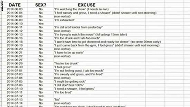 ووضع الزوج، الذي لم يكشف عن هويته، جدولا بعدد المرات التي رفضت فيها الزوجة ممارسة الجنس خلال شهري يونيو ويوليوز، حسب ما نقلت قناة "اتش ال ان" الشقيقة لـCNN. بالإضافة إلى "مبررات" الرفض من بينها "أنا مرهقة" أو "أنت ثمل".