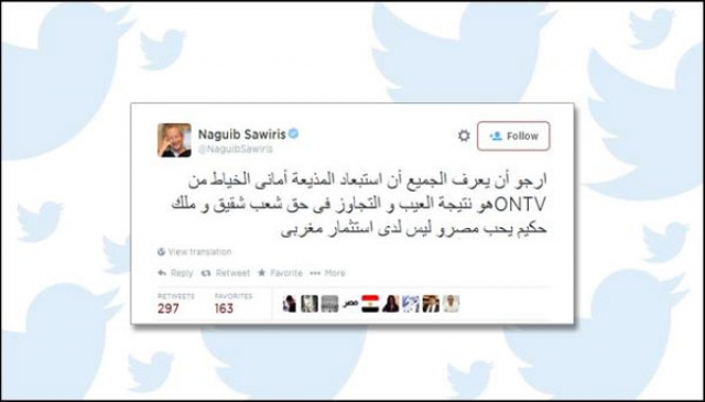 وكتب ساويرس "أرجو أن يعرف الجميع أن استبعاد المذيعة أمانى الخياط من "أون تي في" هو نتيجة العيب والتجاوز فى حق شعب شقيق وملك حكيم يحب مصر وليس لدي استثمار مغربي".