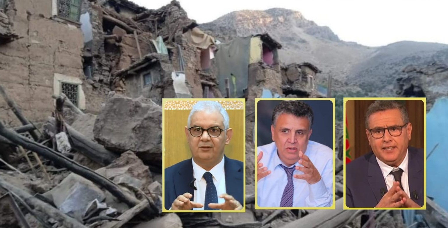 عبد اللطيف وهبي يتوسط عزيز أخنوش (يمينا) ونزار بركة (يسارا) إلى جانب مشهد من الزلزال الذي ضرب إقليم الحوز