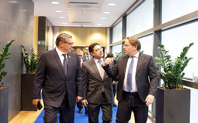 رئيس الحكومة، عزيز أخنوش وناصر بوريطة وزير الخارجية رفقة وزير الشؤون الخارجية المفوض الأوروبي المكلف بسياسة الجوار والتوسع، أوليفر فاريلي