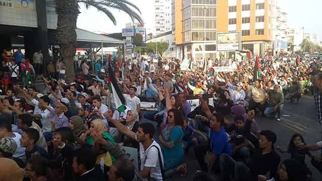 المشاركون انعطفوا يمينا متخذين شارع الحسن الثاني مكانا للتنديد بإرهاب اسرائيل ضد غزة , والذي استشهد فيه عشرات المئات من الأطفال والنساء والشيوخ , وهدمت فيه بيوت الله ومنازل الغزاويين .