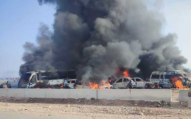 وأظهرت مقاطع فيديو للحادث تم تداولها على منصات التواصل الاجتماعي مشاهد مروعة لاندلاع النيران في عدد من السيارات وتفحم حافلة، وسط صرخات استغاثة ومسارعة أشخاص لمحاولة إطفاء النيران ومساعدة المصابين.