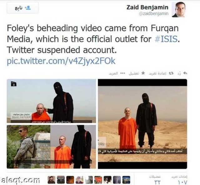 ﺗﺴﺒﺒﺖ تغريدة ﺗﺤﺘﻮي ﻋﻠﻰ ﺻﻮرة ﻟﻤﻘﺘﻞ اﻟﺼﺤﻔﻲ اﻷﻣﺮيكي جيمس فولي على يد تنظيم "داﻋﺶ" ﻓﻲ سوريا ﺑﺈﻏﻼق ﺣﺴﺎب اﻟﺼﺤﻔﻲ زيد بنيامين.