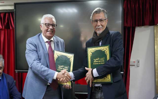 جامع بيضا، مدير أرشيف المغرب (يسارا) ومحمد الشرفاوي، رئيس التجمع الدولي، يوقعان اتفاقية تسليم جزء من أرشيف المغاربة المطرودين من الجزائر