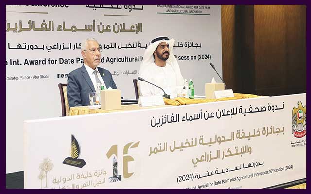 برعاية الشيخ منصور بن زايد آل نهيان نائب رئيس الدولة نائب رئيس مجلس الوزراء رئيس ديوان الرئاسة، قام الشيخ نهيان مبارك آل نهيان وزير التسامح والتعايش رئيس مجلس أمناء جائزة خليفة الدولية لنخيل التمر والابتكار الزراعي، يوم الاثنين 26 فبراير2024 ، بتكريم الفائزين بالجائزة في دورتها السادسة عشرة، بحضور أكثر من 15 وزيراً ووكيلاً للزراعة من الدول المنتجة للتمور 6 من مديري ورؤساء المنظمات الإقليمية والدولية، و62 من أعضاء السلك الدبلوماسي بالدولة.