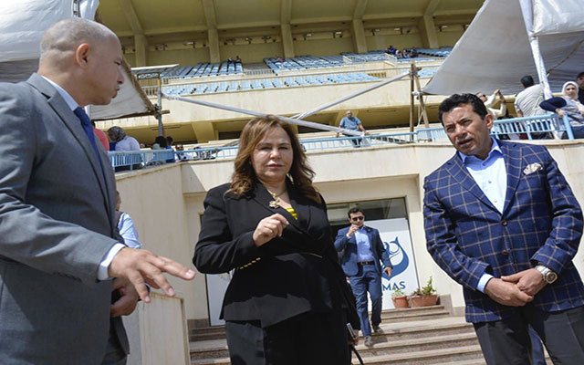 وزير الرياضة المصري يلتقي المغربية حجيج رئيسة الاتحاد الافريقي للكرة الطائرة  بشري حجيج رئيسة الاتحاد الأفريقي للكرة الطائرة صبحي وزير الشباب والرياضة المصري ( يمينا)