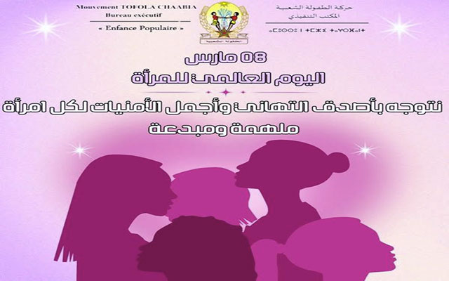 وتوجه حركة الطفولة الشعبية تحية تقدير للمرأة المغربية، التي أثبتت قدرتها على تحقيق مكاسب عديدة، مؤكدة استمرارها في النضال جنبًا إلى جنب معها، من أجل ضمان كافة الحقوق العادلة والمشروعة.