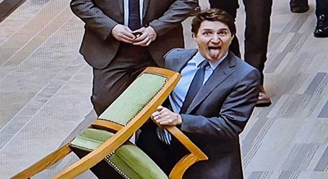 والتقطت صورة لترودو، حيث ظهر وهو يحمل كرسيا، يبدو أنه أخرجه من مكتبه، ويضحك مخرجا لسانه بطريقة ساخرة.