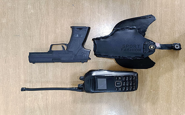 وقد مكنت عملية الضبط والتفتيش المنجزة من العثور بحوزة المشتبه فيه على مجسم بلاستيكي لمسدس، فضلا عن جهاز لاسلكي شبيه بالذي يستعمله عناصر الشرطة.
