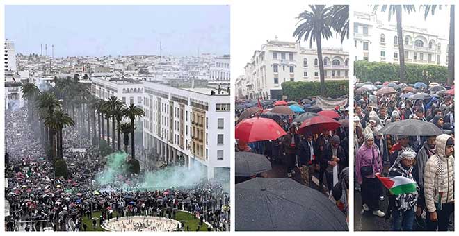 وهكذا، ورغم الأمطار الغزيرة وبرد أبريل، لثاني أسبوع يخرج المغاربة بالعاصمة الرباط في تنظيم حضاري للتظاهر من أجل فلسطين وشعبها، كل شعبها، الصامد المقاوم ضد الهمجية الإسرائيلية المتطرفة لحكومة نتنياهو.
