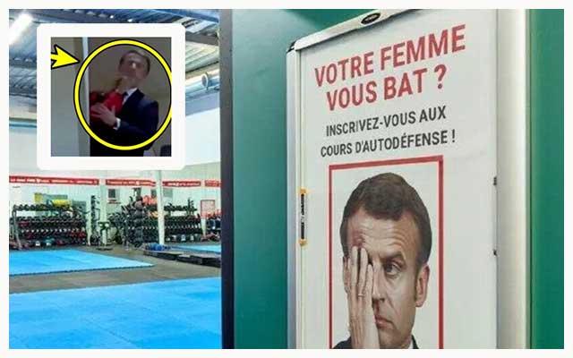 الإعلان الذي ظهر على ما يبدو في إحدى صالات الألعاب الرياضية بفرنسا، يتضمن صورة مُعدلة لماكرون بوجهٍ يحمل آثار كدمة، وعين مغطاة بضمادة، ويعلوه تعليق ساخر: "هل تضربك زوجتك؟ سجّل في دورات الدفاع عن النفس! لمزيد من المعلومات، اتصل بالإدارة."