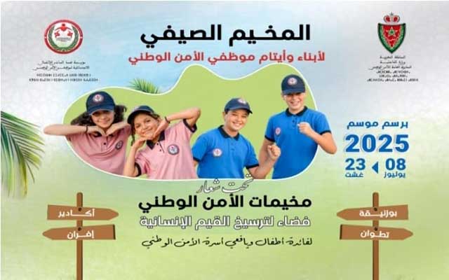 تحت شعار: "مخيمات الأمن الوطني: فضاء لترسيخ القيم الإنسانية"، فتحت مؤسسة محمد السادس للأعمال الاجتماعية لموظفي الأمن الوطني، خلال الأسبوع الجاري، أبواب التسجيل أمام أطفال وأيتام موظفي الأمن الوطني من أجل الاستفادة من فعاليات النسخة السنوية للمخيمات الصيفية 2025، والتي سيتم تنظيمها خلال الفترة الممتدة ما بين 08 يوليوز و 23 غشت 2025 ، بمجموعة من مراكز الاصطياف بمدن أكادير وبوزنيقة وتطوان وإفران.