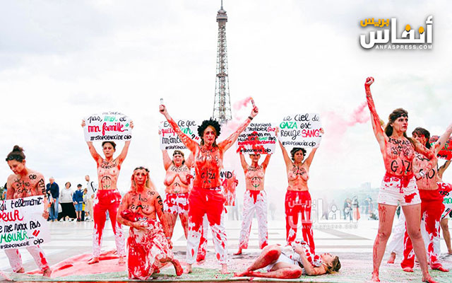 أمام برج إيفل بباريس.. حركة "فيمن" النسوية وبأجساد عارية: إسرائيل وحماس اخرجوا من غزة