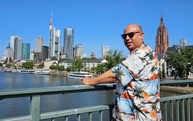 عبد الرحيم أريري بالقنطرة القديمة بمدينة فرانكفورت، وتظر في الأفق كنيسة بارتيليمي ، وأبراج الحي المالي
