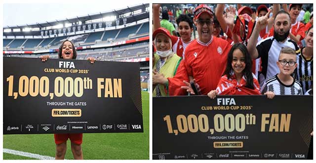 أعلن الاتحاد الدولي لكرة القدم (الفيفا) أن الحضور الجماهيري في كأس العالم للأندية 2025 تجاوز مليون متفرج بالتزامن مع مباراة الوداد الرياضي ضد جوفنتوس الإيطالي، التي جرت الأحد 22 يونيو 2025، مشيرا إلى أن مشجعة مغربية حظيت بشرف أن تصبح المشجع رقم مليون في البطولة.