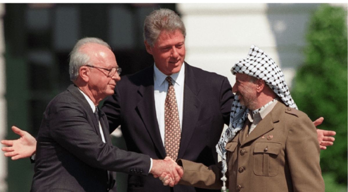 إسرائيل.. على من الدور؟ الرئيس الأمريكي كلينتون يتوسط عرفات ورابين خلال التوقيع على اتفاق أوسلو عام 1993