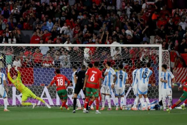 أخرج هدف السبق المغربي لاعبي الأرجنتين من مواقعهم ومارسوا ضغطا رهيبا خاصة عبر اللاعب بريستياني الذي شكل خطورة على الدفاع المغربي، بينما اعتمد لاعبونا على المرتدات التي أثمرت هدفا صنعه معما وترجمه الزابيري في نصف الساعة الأولى من المباراة. رافعا الغلة إلى هدفين. ما دفع بمدرب منتخب الارجنتين إلى تعديل نهجه التكتيكي بالدفع بمهاجم آخر بديلا للاعب وسط، أملا في تقليص الخسارة لاسيما بعد احتكار الأرجنتينيين للكرة دون نجاعة هجومية مقابل استئساد لأشبال الأطلس الذين راهنوا على إنهاء الجولة الأولى بفوز بهدفين لاسيما في ظل اجتياح حقيقي للمنتخب الأرجنتيني المشاكس في الانفاس الاخيرة من الجولة الأولى