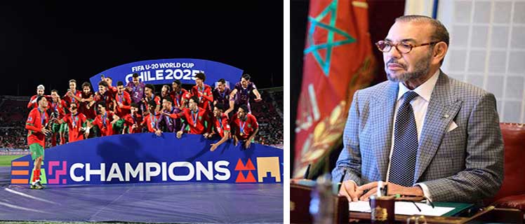 تعلن وزارة القصور الملكية والتشريفات والأوسمة أنه بتعليمات من الملك محمد السادس، سيخصص يوم  الأربعاء 22 أكتوبر 2025 ، للمنتخب الوطني لكرة القدم لأقل من 20 سنة ، بطل كأس العالم لهذه الفئة، التي احتضنتها الشيلي، استقبال يليق بأبطال هذا الإنجاز الرياضي التاريخي غير المسبوق.
