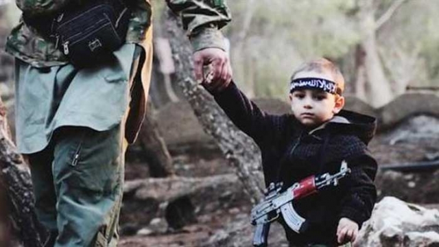 في الصور يظهر الصبي، الذي أخذه والده الجهادي منذ أكثر من عام، مرتديا القميص الأسود، الزي الرسمي لداعش، ويحمل مدفعا رشاشا.