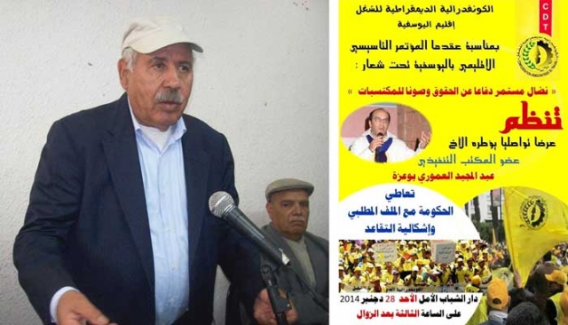 علمت "أنفاس بريس" أن الكونفدرالية الديمقراطية للشغل باليوسفية ستعقد مؤتمرها التأسيسي الإقليمي تحت شعار "نضال مستمر دفاعا عن الحقوق وصونا للمكتسبات"، وذلك يوم الأحد 28 دجنبر من السنة الجارية.