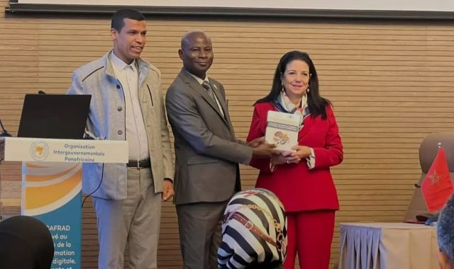 كوفي ديودوني، مدير كافرد يتوسط الوزيرة أمل السغروشني، وموسى المالكي، رئيس المنتدى الإفريقي للتنمية والأبحاث الجغرافية والاقتصادية