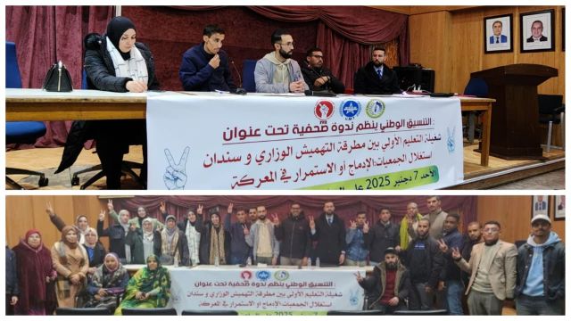 نظم التنسيق الوطني للنقابات الثلاث (CDT – FNE – UMT) بتنسيق مع التنسيقيات الإقليمية، ندوة صحافية وطنية يوم الأحد 07 دجنبر2025 بالرباط، تحت شعار: "شغيلة التعليم الأولي بين مطرقة التهميش الوزاري وسندان استغلال الجمعيات: الإدماج أو الاستمرار في المعركة"