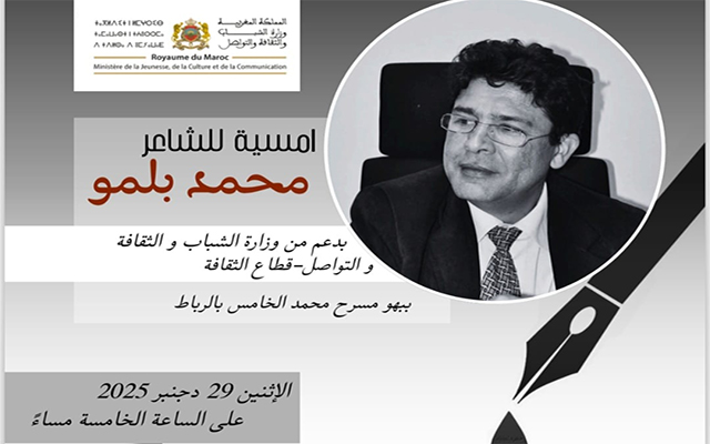بدعم من وزارة الشباب والثقافة والتواصل – قطاع الثقافة، سيحل الشاعر والإعلامي محمد بلمو ضيفا على بهو مسرح محمد الخامس بالرباط يوم الاثنين 29 دجنبر 2025، في الخامسة من مساء، ليحيي امسية شعرية يغرد خلالها بعدد من نصوصه الشعرية، تقدم وتدير هذه الامسية الشاعرة والإعلامية فتيحة النوحو.