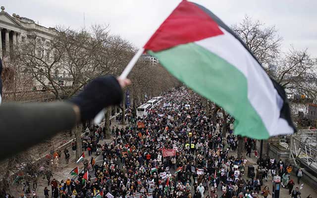 أوقفت الشرطة البريطانية الناشط الحقوقي بيتر تاتشل، السبت 31 يناير 2026، خلال مسيرة مؤيدة للفلسطينيين لحمله لافتة تحمل شعار "عولمة الانتفاضة"، وفق ما أفادت مؤسسته.
