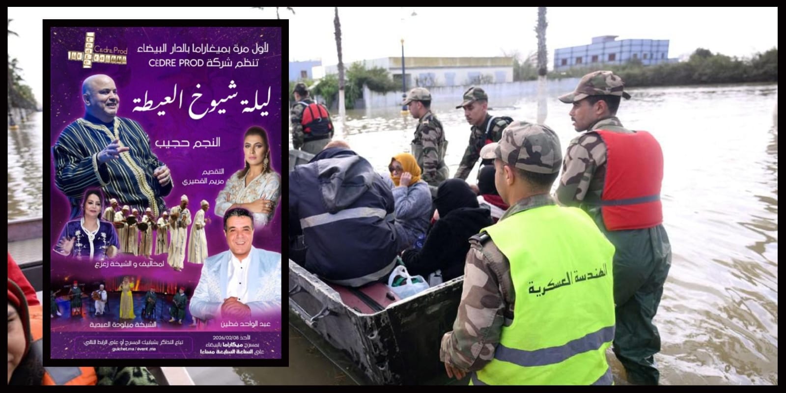 في ظل الأوضاع الصعبة التي تعيشها المملكة جرّاء الفيضانات التي ضربت عددًا من المدن، وأدت إلى نقل آلاف المواطنين إلى مناطق آمنة، أعلنت شركة cèdre prod قرارها تأجيل سهرة شيوخ العيطة التي كان من المرتقب تنظيمها يوم 8 فبراير بفضاء ميغاراما، إلى موعد لاحق سيتم الإعلان عنه في حينه.