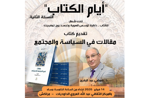 تحت شعار: "الكتاب...ذاكرة تؤسس للهوية وتجسد روح تمغربيت" تنظم الأكاديمية الدولية للتكوين والمواكبة، ضمن فعاليات النسخة الثانية من "أيام الكتاب"، لقاءً ثقافياً وفكرياً متميزاً يوم السبت 14 فبراير 2026، ابتداء من الساعة الخامسة مساء، بالمركز الثقافي عبد الله العروي ـ الداوديات بمدينة مراكش، يتمحور حول تقديم كتاب: الأستاذ عبد الرفيع حمضي الموسوم بـ "مقالات في السياسة والمجتمع"