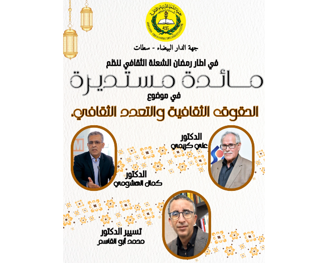 أعلن بلاغ جمعية الشعلة للتربية والثقافة جهة الدار البيضاء سطات عن تنظيم مائدة مستديرة فكرية في موضوع: "الحقوق الثقافية والتعدد الثقافي"، يؤطرها كل من الدكتور علي كريمي أستاذ التعليم العالي بجامعة الحسن الثاني عين الشق، والدكتور كمال الهشومي أستاذ التعليم العالي بجامعة محمد الخامس أكدال بالرباط، بمشاركة ثلة من المثقفين والأكاديميين والمهتمين، وذلك يوم الجمعة 27 فبراير 2026 على الساعة الرابعة والنصف بعد الزوال بالقاعة الكبرى لدار الشباب الحي المحمدي.