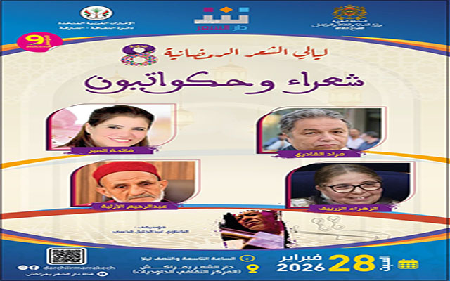 تنظم دار الشعر بمراكش ليلة جديدة من "شعراء وحكواتيين" ضمن فعاليات برنامجها الثقافي والشعري للموسم التاسع، وذلك يوم السبت 28 فبراير 2026 على الساعة التاسعة والنصف ليلا بفضاء الدار (المركز الثقافي الداوديات بمراكش). وتشهد هذه الأمسية، الشعرية والفنية، مشاركة الشعراء والفنانين: مراد القادري، فاتحة المير، الزهرة زرييق، وعبد الرحيم الأزلية. إلى جانب المشاركة المتميزة للفنان الكناوي عبد الجليل قدسي، في تواشج لأنماط القول الإبداعي وفي تناغم تام مع القصيدة وتعبيراتها الفنية.