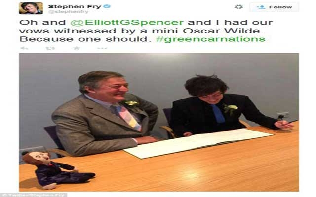 نشر النجم الكوميدي البريطاني ستيفن فراي (57 عاماً) صوراً لعقد قرانه على صديقه الشاب اليوت سبينسر (27 عاماً). وغرد فراي على الصورة المنشورة عبر حسابه بموقع التواصل الإجتماعي "تويتر" بتعليق تضمن: "يا إلهي دخلنا أنا وإليوت سبينسر الغرفة كشخصين وقمنا بإمضاء كتاب لنخرج كإنسان واحد، مذهل!". وسبق أن أعلن النجم البريطاني ستيفن فراي قبل عشرة أيام عن علاقته و"خطوبته" من صديقه اليوت سبينسر الذي يصغره بثلاثين عاماً.