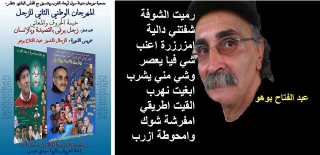 عبد الفتاح بوهو انتبهت إليه بذكاء واعتراف جميل جمعية مهرجان سوق الأربعاء الغرب، وهي تستضيفه في تكريم يليق به ضمن فعاليات الدورة الثانية، التي تحمل اسمه، من "المهرجان الوطني للزجل"، والتي ستقام أيام 6 و7 و8 مارس بعنوان "خيمة الحروف" تحت شعار" زجل يرقى بالقصيدة وبالإنسان"، وتحتضن حلقاتها قاعة العروض بثانوية سيدي عيسى، بمشاركة أسماء زجلية من الجنسين ومن مدن مغربية مختلفة..