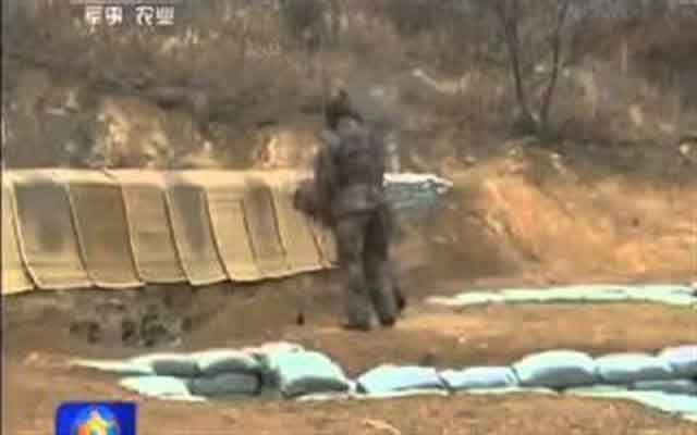 الجندي يقوم بسحب فتيل القنبلة، إلقائها، إلا أن الرمية لم تكن قوية وسقطت خلفه.