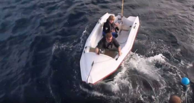 وظهر الرجلان الخبيران بأسماك القرش، جيف كار وأندي كازاغراند، وهما في هلع، بينما كان القرش الأبيض الكبير يستخدم فكيه القويين وذيله لدفع القارب مما أدى إلى تمايله بشكل خطير.
