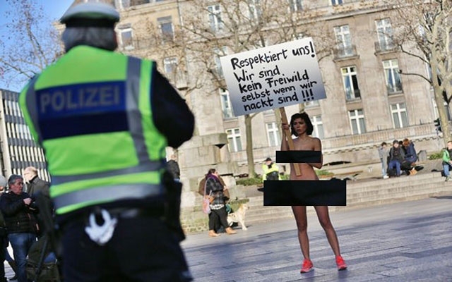 احتجت الفنانة السويسرية، ميلو مواريه، عارية خارج كاتدرائية كولونيا الألمانية حاملة لافتة كتب عليها: "احترمونا! نحن لسنا لعبة مجانية، حتى ولو كنا عراة".