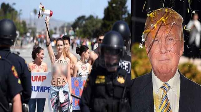 ستقبل المئات من المحتجين، دونالد ترامب المرشح الجمهوري المحتمل للرئاسة الأمريكية في انتخابات 2016، بالبيض وصدور النساء العارية في ولاية كاليفورنيا. وسادت حالة من الفوضى خارج مقر مؤتمر الحزب الجمهوري أين كان ترامب يلقي كلمة له، فيما قامت الشرطة بالإحاطة بالمحتجين الذين حاولوا إغلاق الطرق المؤدية للمركز. وخلعت عدة سيدات من المعترضات على تصريحاته ملابسهن العلوية ليظهروا صدورهن كنوع من الاعتراض، فيما ألقى عدد من المتظاهرين البيض على تمثال كرتوني له. الاحتجاجات أجبرت ترامب على تأجيل إلقاء كلمته لأكثر من 40 دقيقة، بينما حاول المتظاهرون خرق الحواجز التي وضعتها قوات الشرطة مرددين شعارات مناهضة للمرشح الجمهوري. في غضون ذلك، اعتقلت قوات مكافحة الشغب الأمريكية، الجمعة 29 أبريل، نحو 20 متظاهرا جنوب كاليفورنيا، خلال احتجاجات نظمت ضد ترامب. وقام المتظاهرون بسد الطرق ورفع أعلام المكسيك، في الوقت الذي تعرض فيه بعض أنصار ترامب للضرب كما تحطمت عشرات السيارات.