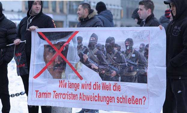 ورفع المشاركون في الوقفة لافتات كبيرة ضد تنظيم الحمدين كُتب عليها باللغات الألمانية والفرنسية والإنجليزية: "قطر تدعم وتمول الإرهاب"، و"شعوب العالم يريدون إدانة قطر بدعم الإرهاب".