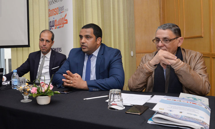 : نبيل توفيق (يسارا) إلى جانبه منير الجزولي، رئيس تجمع المعلنين بالمغرب، مديح وديع، رئيس جمعية المستهلكين المتحدين لحماية المستهلك بالدار البيضاء
